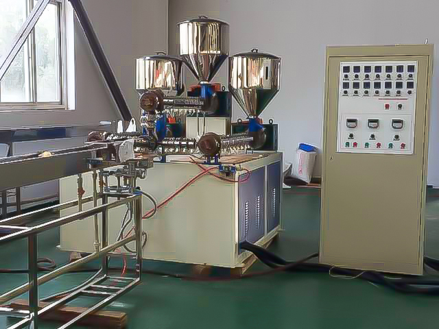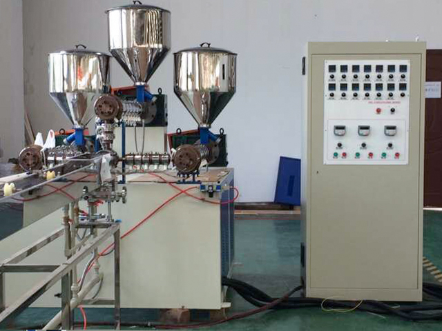 ML13A三拼色吸管共挤挤出机组由:挤出机、机头、冷却定型装置、牵引切割装置、理管输送装置(选配)等部分组成,生产三拼色的花色吸管。采用全新BM分离型参数设计的45mm直径螺杆:长径比28:1,塑化效果好,双螺杆平行布置,挤出量大,出胶稳定;是生产特种花色饮料吸管的专业设备。