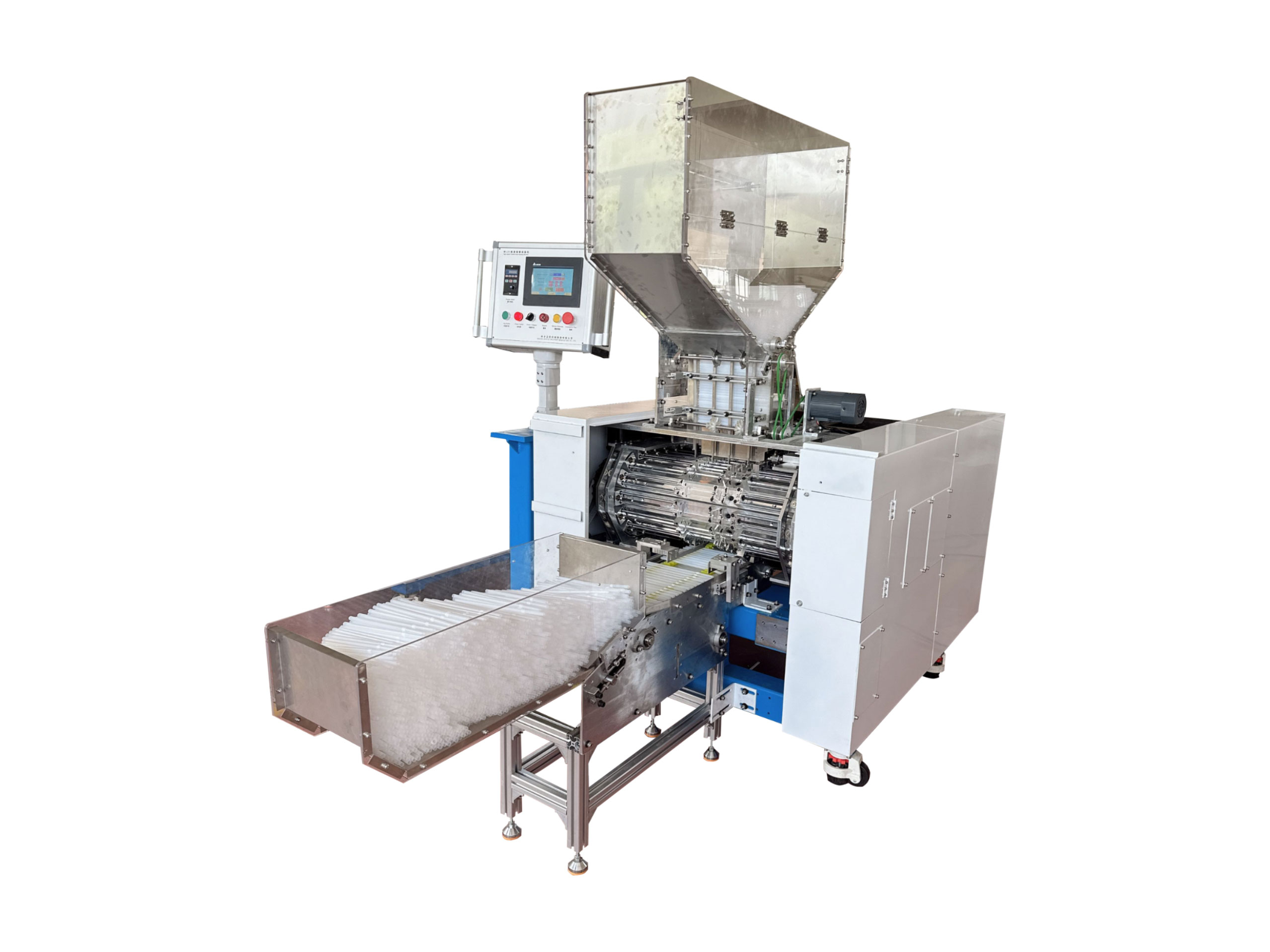 ML23系列全自动可弯吸管成形机是将直管坯加工成可弯吸管的一种自动化设备。 直管坯加入成形机上部料斗,经45组成形牙针和1对成形牙轮连续动作后将弯管成品自动输送出来,具有连续高效生产的能力。通过更换部分零件,可以实现多种孔径规格弯管的生产